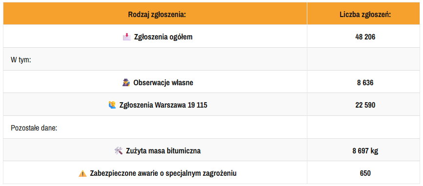 Na podstawie tych zgłoszeń podejmowane są kontrole i – w razie potrzeby – interwencje. W listopadzie zakończyły się m.in. wykorzystaniem 1025 kg masy bitumicznej do naprawy nawierzchni oraz zabezpieczeniem 48 awarii, które bezpośrednio zagrażały bezpieczeństwu ruchu.