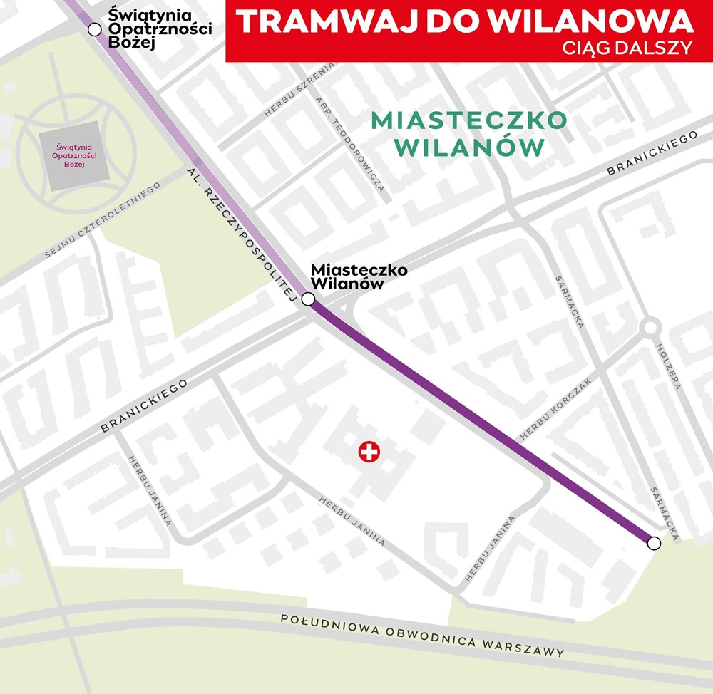W październiku 2024 r. oddaliśmy do użytku nową trasę tramwajową do Wilanowa. Tramwaje dojeżdżają do terminala przy ul. Branickiego. W ciągu roku z nowych linii 14, 16 i 19 skorzystało już 20 milionów pasażerów, z czego 8,4 mln podróżnych wsiadło do tramwajów na nowym odcinku. Dokumenty planistyczne i dokumentacja przedprojektowa zakładają możliwość budowy dalszych odcinków trasy – w powiązaniu z zagospodarowaniem kolejnych obszarów dzielnicy Wilanów.