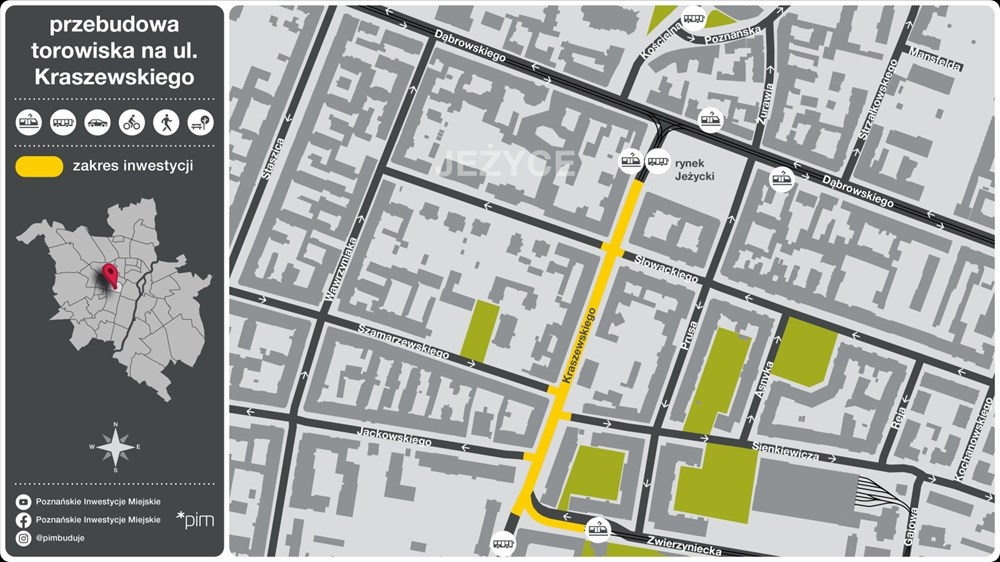 Projektant ma zaprojektować przebudowę układu torowego na odcinku od Rynku Jeżyckiego do skrzyżowania z ulicą Zwierzyniecką, wraz ze skrzyżowaniem Zwierzynieckiej i Kraszewskiego. Najważniejszym elementem tego zadania jest zdecydowanie przebudowa i zmiana charakteru przystanków tramwajowych przy Rynku w ciągu Kraszewskiego. Obecne platformy zupełnie nie odpowiadają współczesnym standardom a do tego bardzo utrudniają wsiadanie i wysiadanie z tramwajów osobom starszym czy o ograniczonej mobilności.