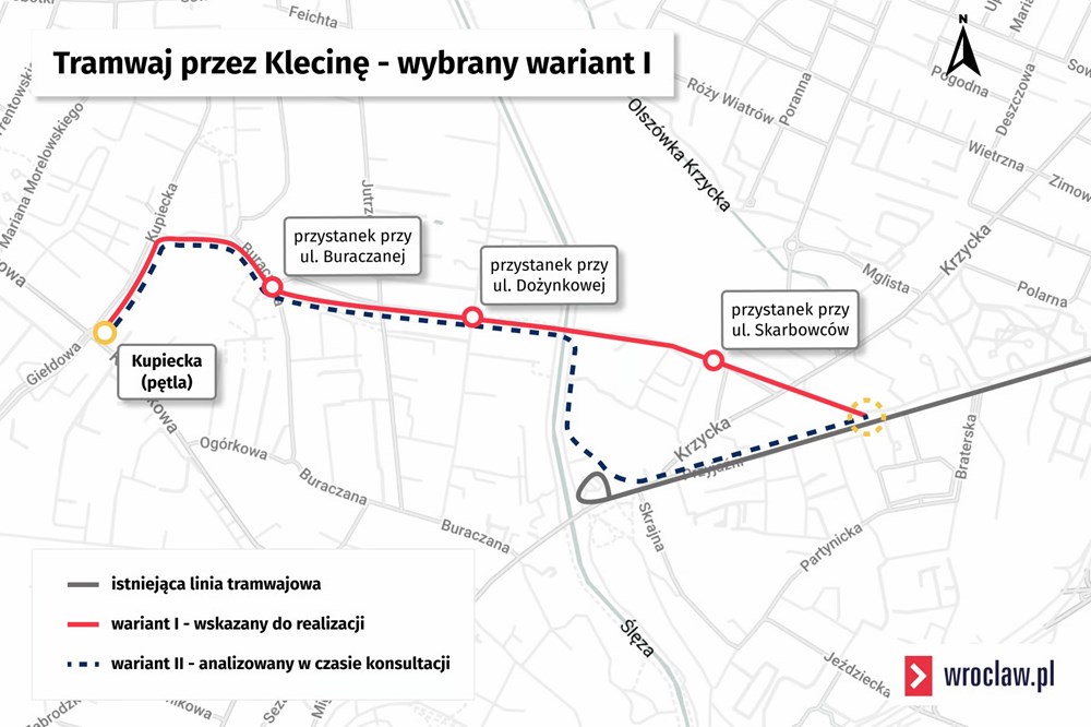 Tramwaj do pętli Kupiecka w 2028 roku Dolnośląska Pracownia Projektowa, z którą miasto wiosną podpisało umowę, ma dwa lata – najpóźniej do 4 kwietnia 2027 roku na przygotowanie dokumentacji. Chodzi o koncepcję, projekt budowlany i wykonawczy oraz uzyskanie niezbędnych decyzji administracyjnych Spółka Wrocławskie Inwestycje szacuje, że budowa może potrwać 1,5 roku, a po nowej trasie mieszkańcy będą mogli podróżować pod koniec 2028 roku.