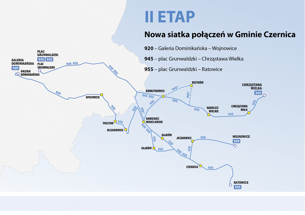 Linia 920 zostanie wydłużona i kursować będzie na trasie z Wojnowic do Galerii Dominikańskiej. Linia 945 pojedzie do Chrząstawy Wielkiej, a linia 955 do Ratowic – obydwie wyruszą z placu Grunwaldzkiego. Jak tłumaczy przedstawicielka UMW, zmiany obejmują również dwie linie miejskie: 120 i 121, na których także pojawią się nowe autobusy. Przypomnijmy, że na liniach aglomeracyjnych funkcjonuje już system Urbancard, co oznacza pełną integrację systemu biletowego. Dotyczy to gmin: Miękinia, Kąty Wrocławskie, Czernica, Wisznia Mała, Żórawina, Kobierzyce i Siechnice.